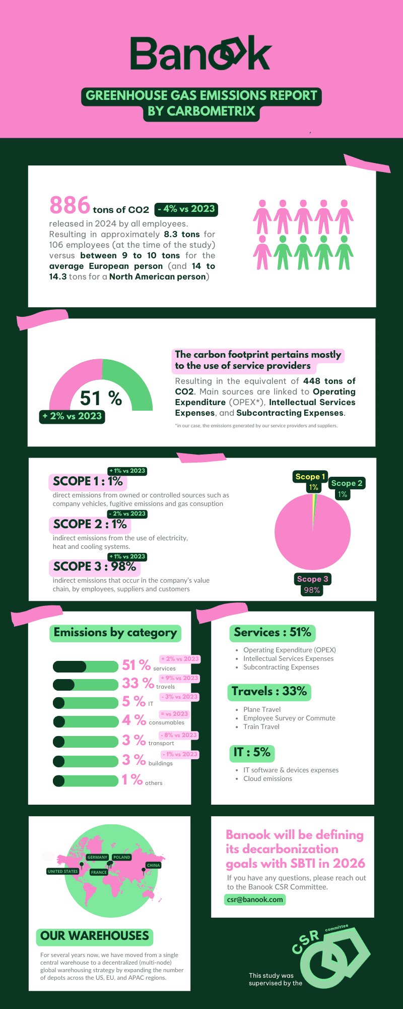 The dedicated infographic accompanying this article presents a detailed overview of our emissions volumes and sources in 2024 compared to 2023. This comparison is particularly meaningful given the significant growth of the Banook Group during this period, with our workforce expanding from 60 to 106 team members. Despite this rapid development, we successfully maintained a stable carbon footprint, reflecting the collective engagement of our teams and the effectiveness of our sustainability strategy.